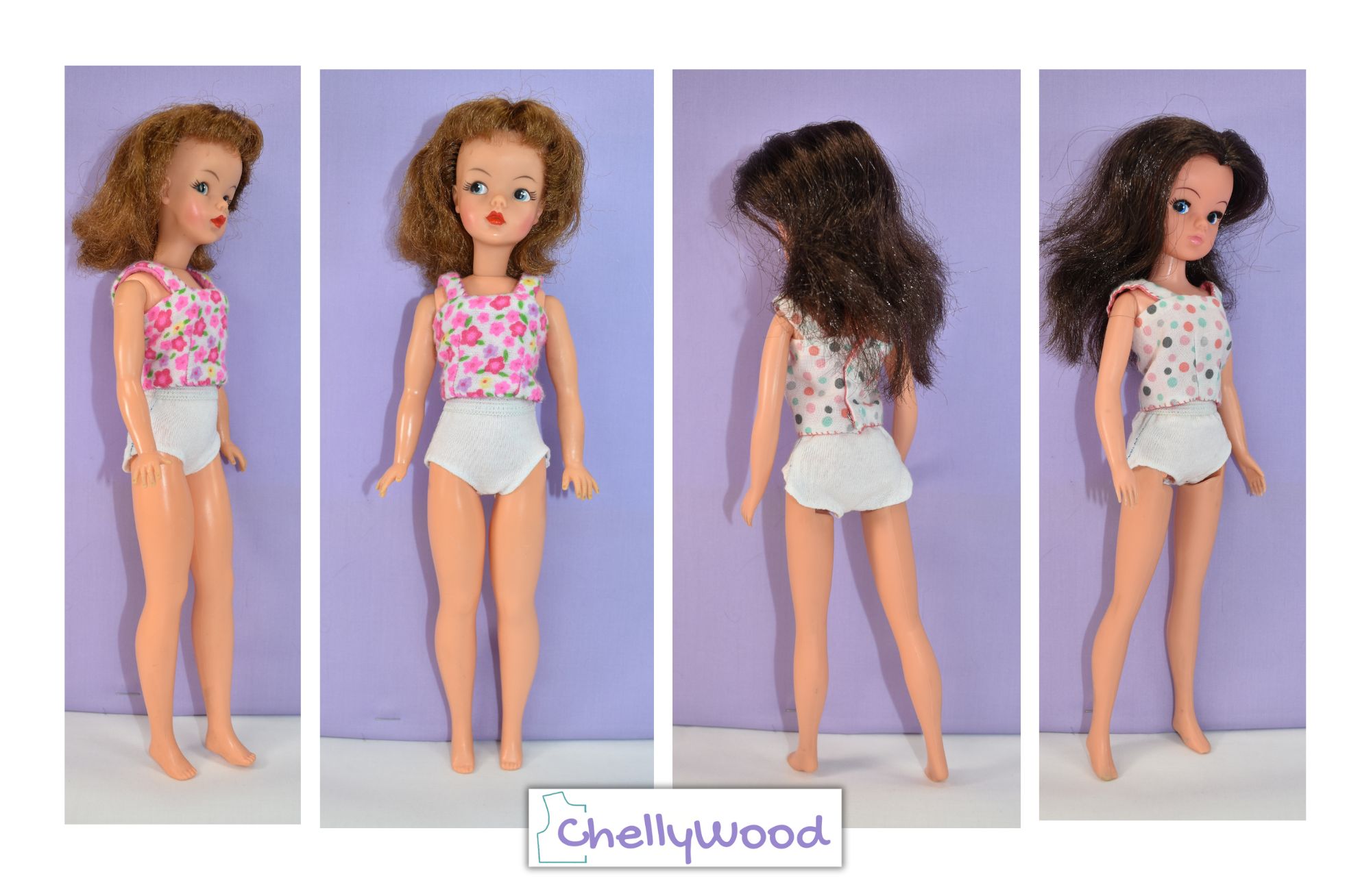 Now, you can probably tell in the image above that Ideal Tammy (and interestingly, the earliest Sindy dolls) have very different body types from the 1970’s and 1980’s Pedigree Sindy dolls, so be advised that my patterns for Pedigree Sindy below will include the reversible tank top (or “vest” for those of you in the UK) that Sindy wears on the right-hand images in the photo collage above; whereas the Tammy dolls will use a different tank top/vest pattern.