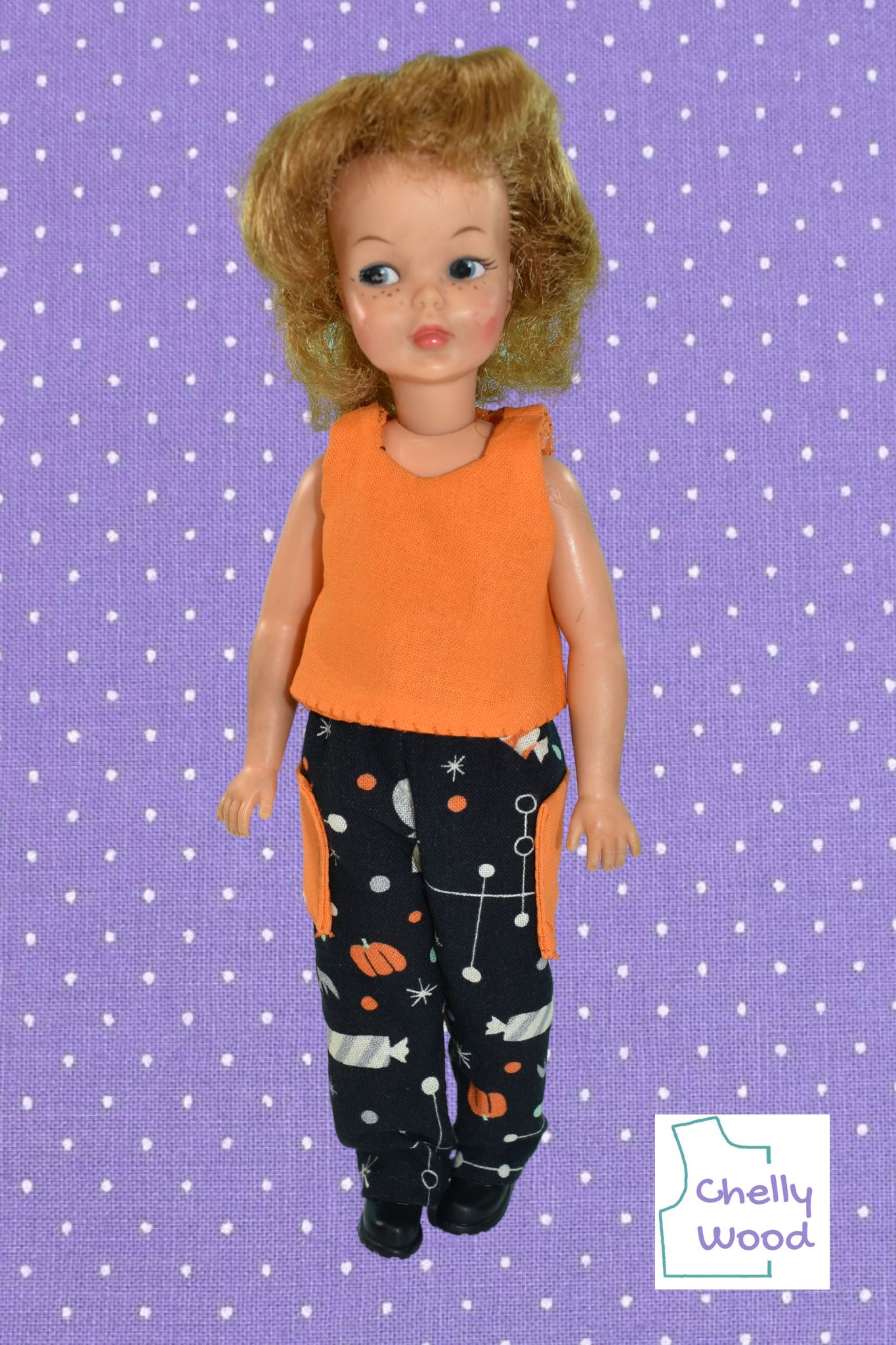 This Halloween cropped tank top and retro-style Halloween cargo pants outfit was first posted, here on ChellyWood.com, to fit the Creatable World dolls. I’ve also found that it fits many other dolls too. Scroll down to see a full list of all the dolls that can wear this outfit.