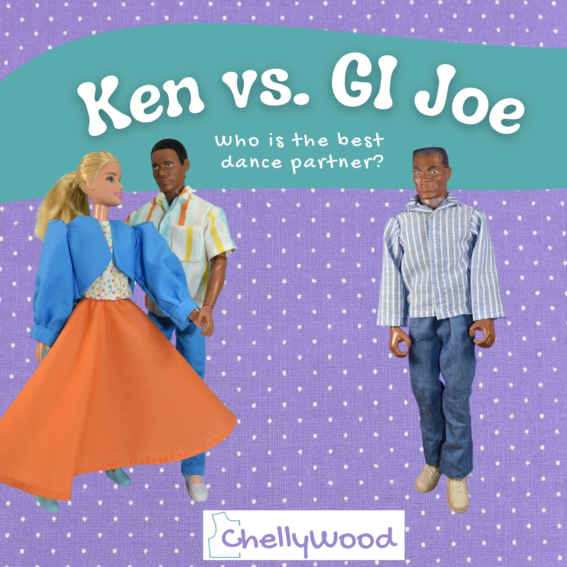 In this purple background thumbnail, the text reads "Ken versus GI Joe: Who is the best dance partner?" There's an image of a blond Barbie dancing with African American Ken from Texas A&M articulated EMT dolls, and standing out as the third leg is a somewhat shorter crew cut GI Joe (also African American) with kung fu grip hands.