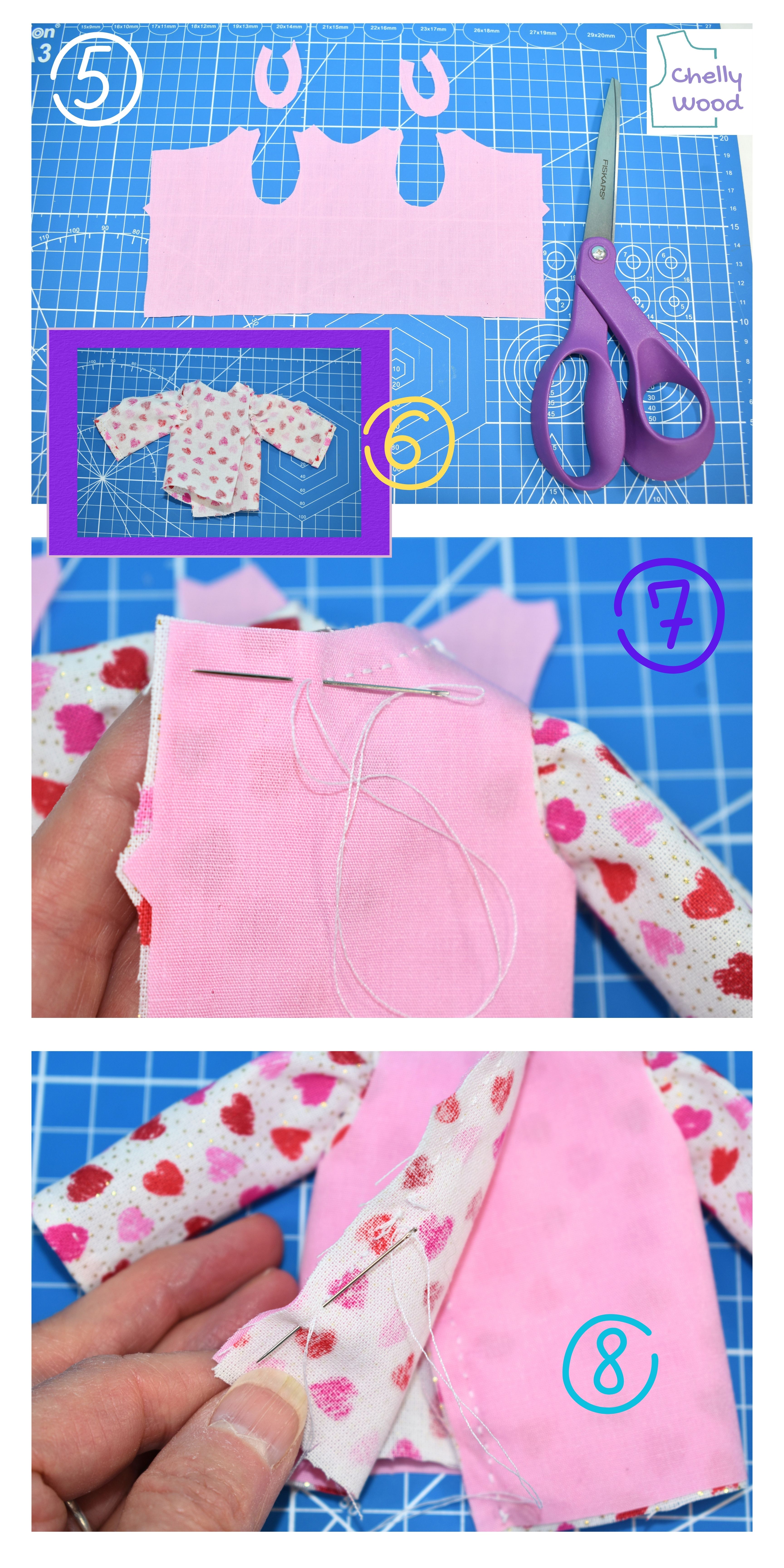 If you would like to learn how to make alterations to your doll clothes patterns, scroll down below the blue sewing needle with purple X-shaped threads, to learn more about my “How to Alter Doll Clothes Patterns” online course.