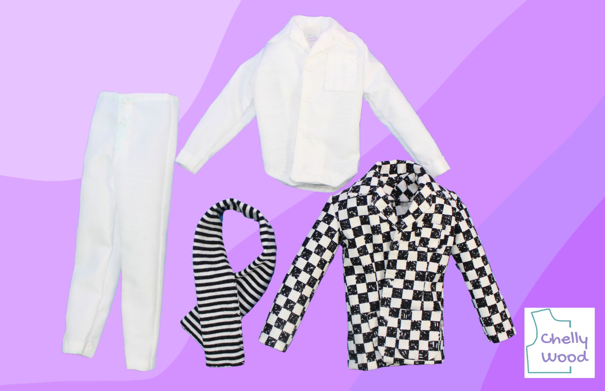 The image above shows each piece of the ensemble I created, using Advance 2899. Because my early Ken is rather short (regular Ken and Ryan are about a quarter inch or 5 mm taller than him), I wasn’t surprised to find that the trousers were a little high-water on most of the male fashion dolls I tried this outfit on.