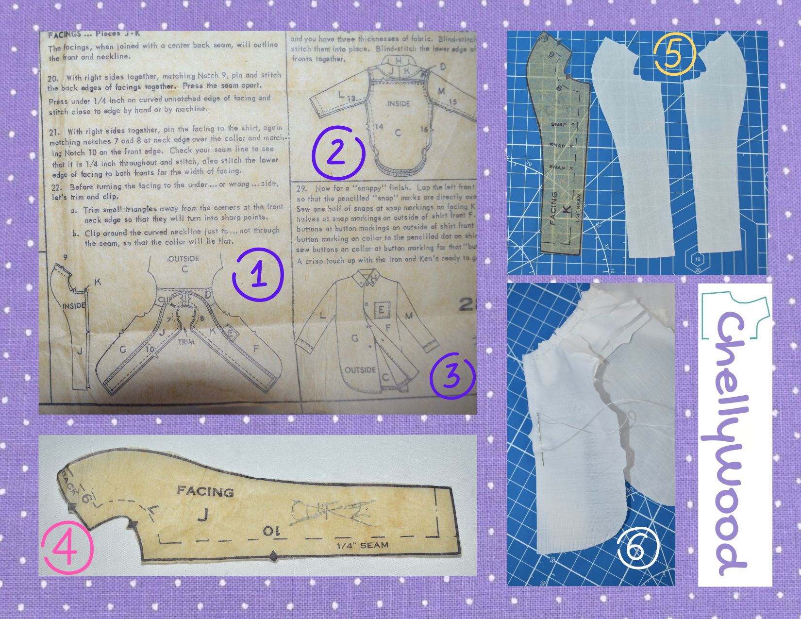 So I was pleasantly surprised when my vintage Ken doll’s Advance 2899‘s instructions for making a formal collared shirt suggested a more finished look to the shirt’s facing along the collar’s edge and the front closure of the View 2 shirt.