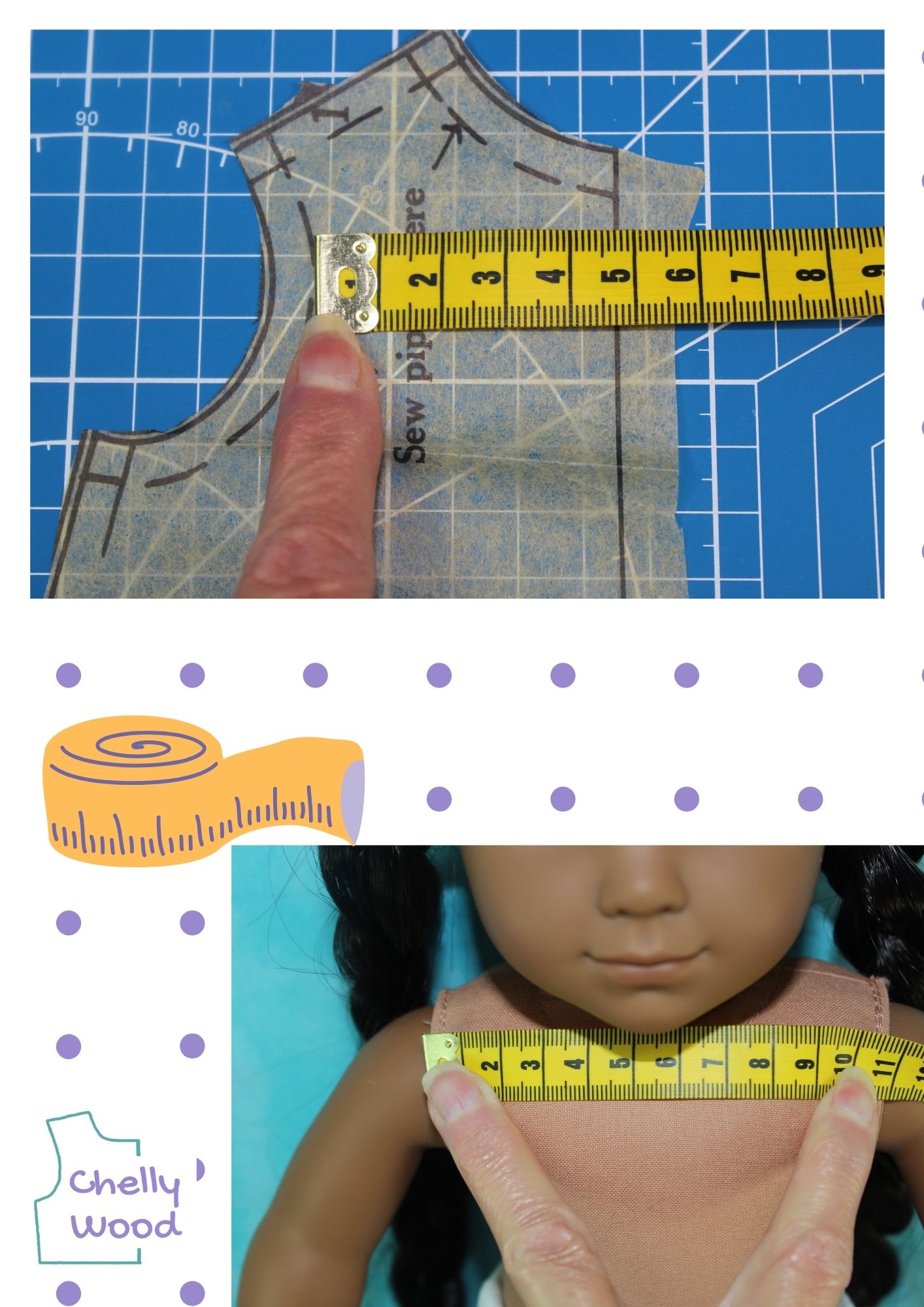 Then, in the bottom image, I’m comparing that measurement to the distance across the doll’s upper chest, to see if the pattern will fit.