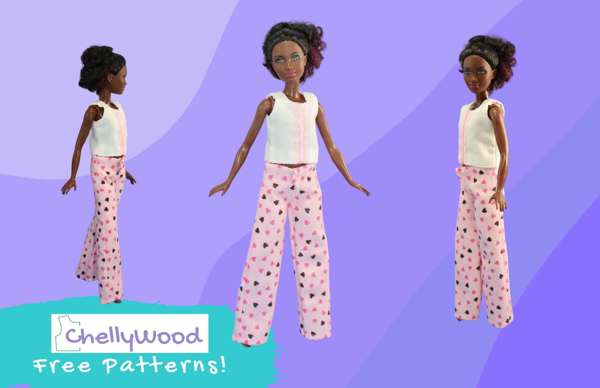 With Valentine’s Day right around the corner, let’s make some heart-printed pajama pants for your 10 inch dolls, shall we? Today’s tutorial video will show you how to make the pajama pants I’m showing on my Petite Barbie and my African American Skipper dolls.