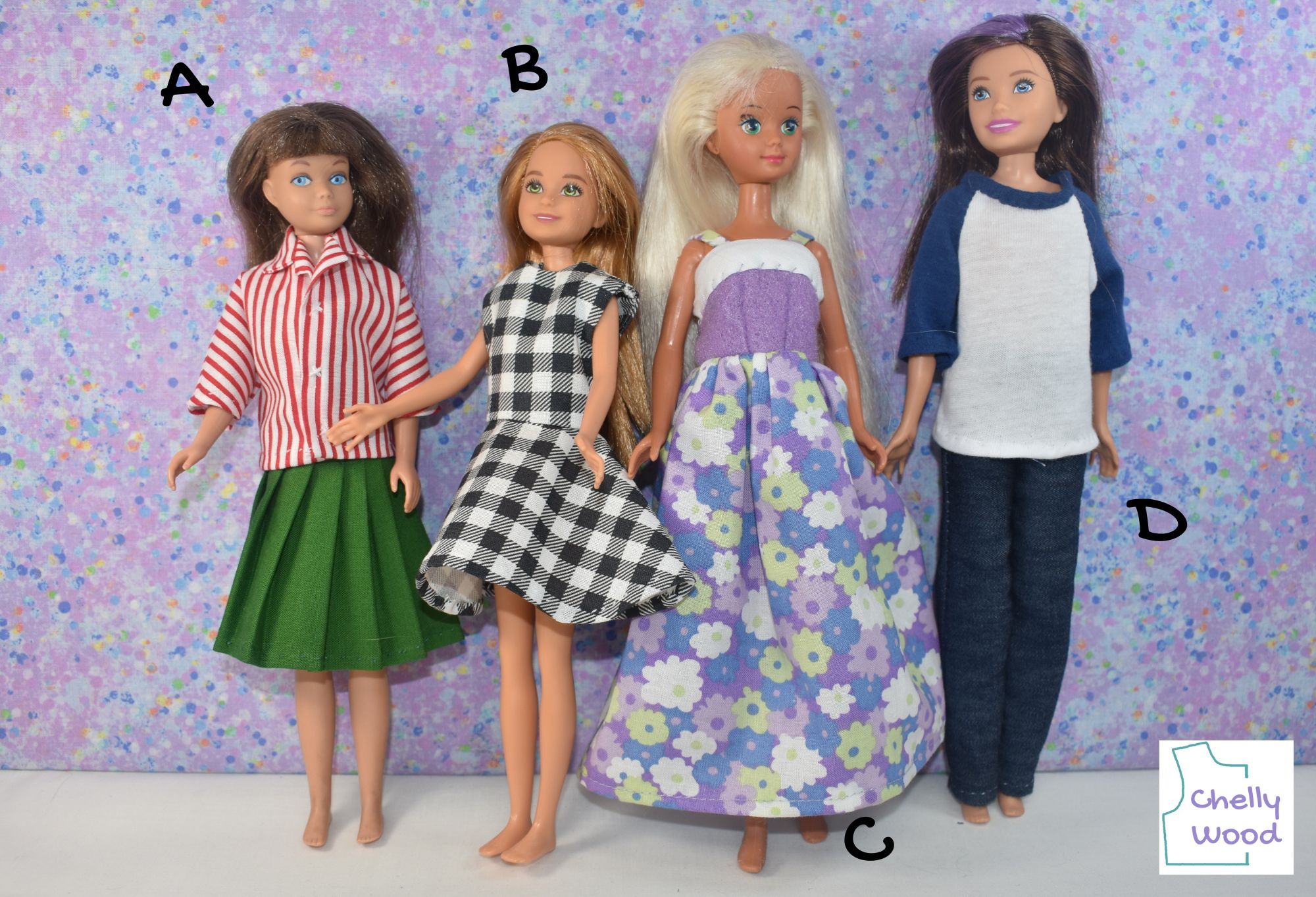 Now as you probably know, modern 10 inch Skipper dolls are larger than vintage 9 inch Skipper dolls, as you can see in the image below. For those who are new to sewing for dolls, image A shows a vintage Skipper; image B shows a modern Stacie (whose measurements are comparable to vintage Skipper); image C shows a Skipper doll from the 1990’s; and image D is today’s modern Skipper.