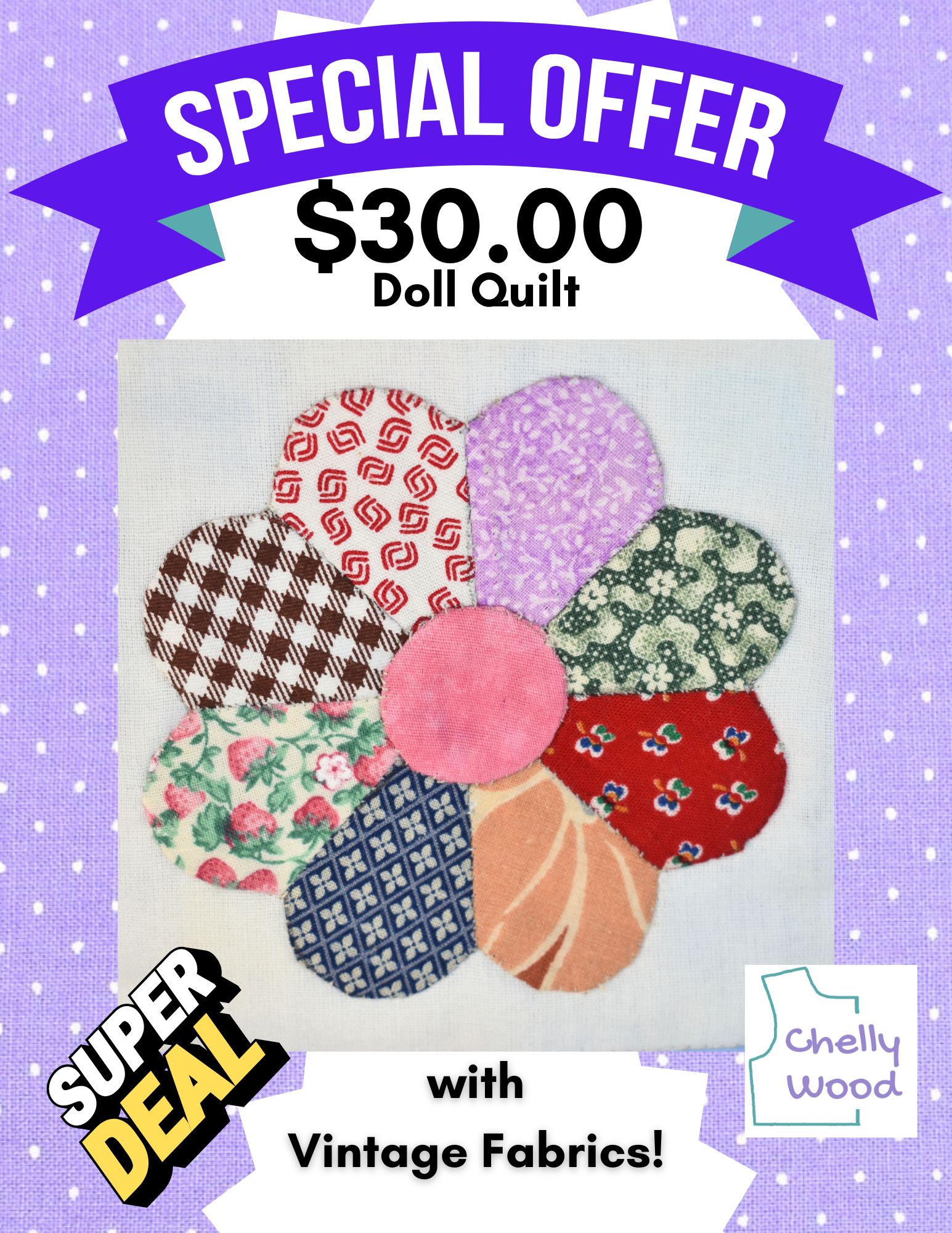 This little Baby Dresden quilt for dolls was made by my mother-in-law, Anita, who has just reduced her price from $35 to $30 for her incredible handiwork! (I recommended that she offer this little quilt for dolls at a slightly higher price of $40 because I know how talented she is.)